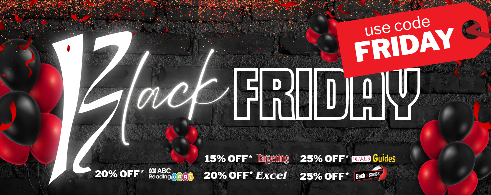 20% OFF Excel, 20% OFF ABC Reading Eggs, 15% OFF Targeting, 25% OFF Blakes Guides and 25% OFF Back to Basics workbooks.