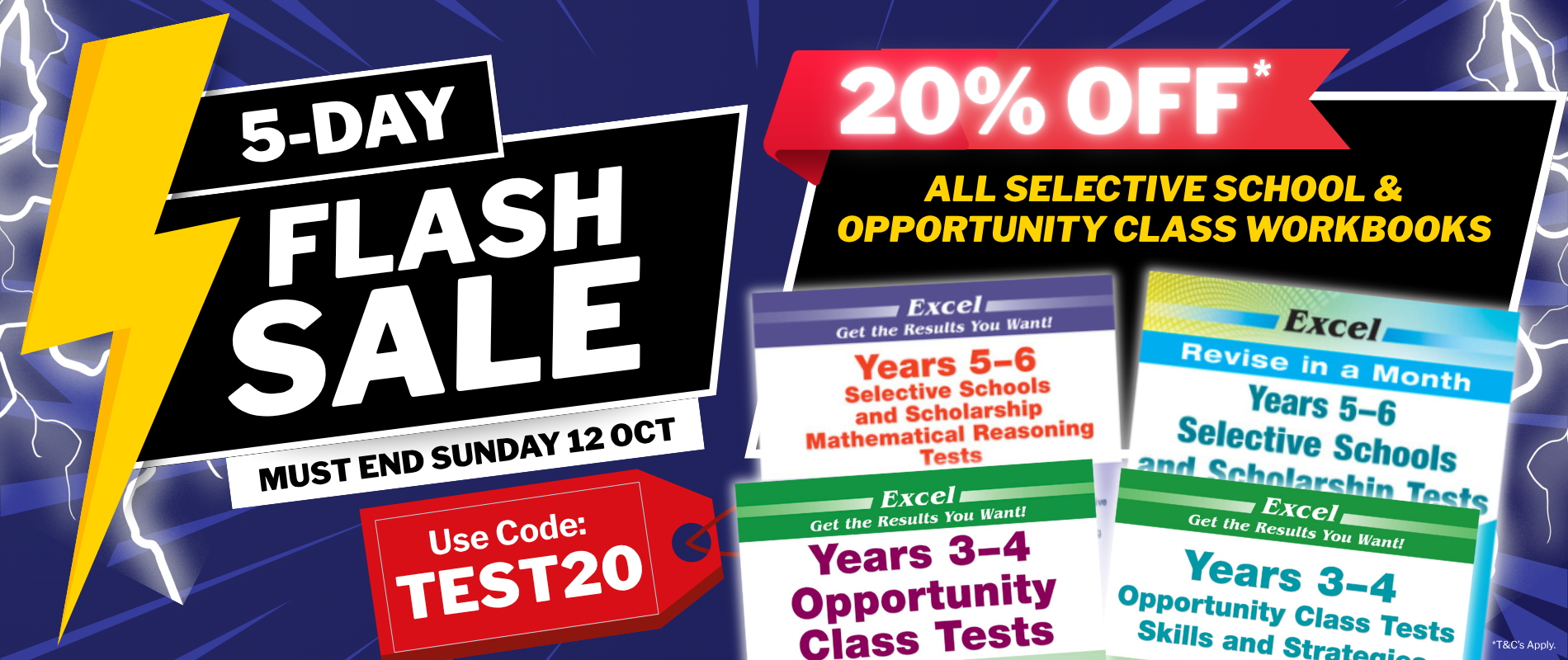 Claim 20% OFF* Selective School and Opportunity Class workbooks during our 5-Day Flash Sale! Simply use the coupon code TEST20 at checkout to redeem your exclusive deal.